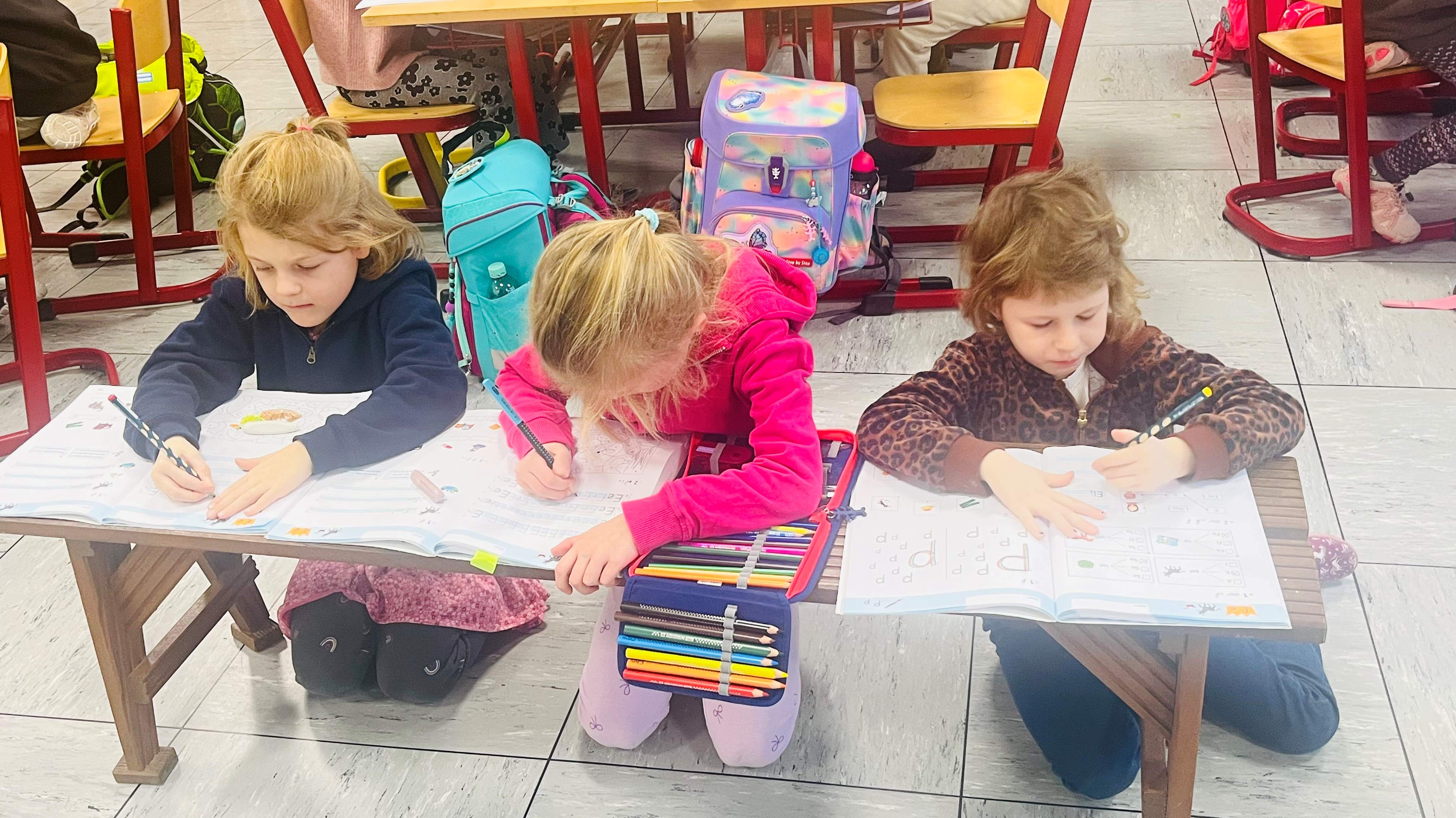 So können sie je nach Aufgabe und Konzentrationsbedarf oder persönlichem Wohlbefinden den richtigen Arbeitsplatz wählen. Neben den regulären Tischen stehen Regale als Stehtisch sowie gemütliche Bodenarbeitsplätze bereit - hier dient eine Bank als praktische Schreibfläche oder die Kinder arbeiten im Liegen auf einer Matte. Seit Neuestem bereichern in den ersten Klassen auch eingehängte Tische das Angebot: Sie lassen sich schnell selbständig von den Kindern an einer Leiste befestigen und ermöglichen so, auch draußen auf dem Flur im Sitzen oder Stehen zu arbeiten.