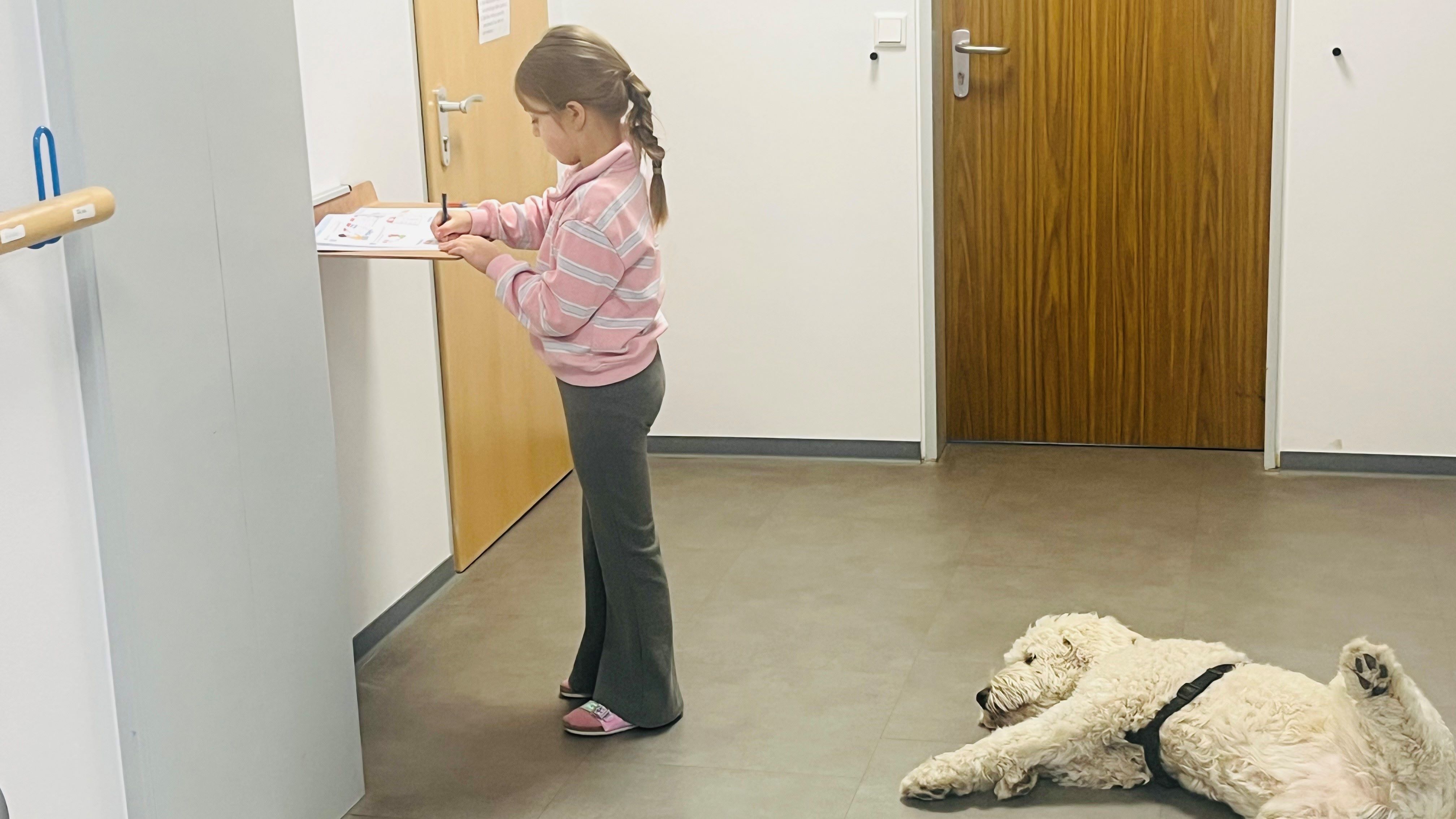 So können sie je nach Aufgabe und Konzentrationsbedarf oder persönlichem Wohlbefinden den richtigen Arbeitsplatz wählen. Neben den regulären Tischen stehen Regale als Stehtisch sowie gemütliche Bodenarbeitsplätze bereit - hier dient eine Bank als praktische Schreibfläche oder die Kinder arbeiten im Liegen auf einer Matte. Seit Neuestem bereichern in den ersten Klassen auch eingehängte Tische das Angebot: Sie lassen sich schnell selbständig von den Kindern an einer Leiste befestigen und ermöglichen so, auch draußen auf dem Flur im Sitzen oder Stehen zu arbeiten.
