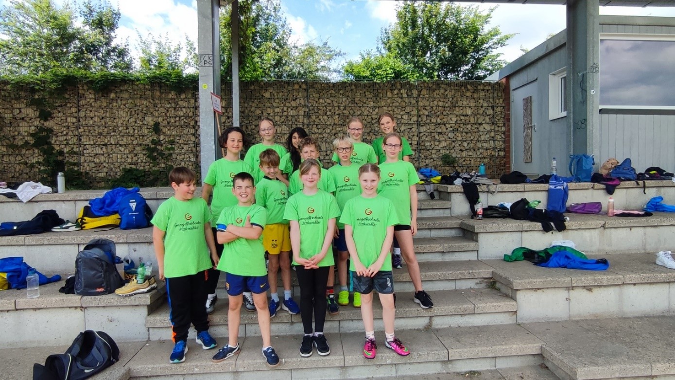Mit viel Freude und Motivation sind die 12 Schüler:innen der Gangolfschule zur Kreismeisterschaft der Grundschulen im Bereich der Leichtathletik nach Greven ins Stadion an der Emsaue gefahren.